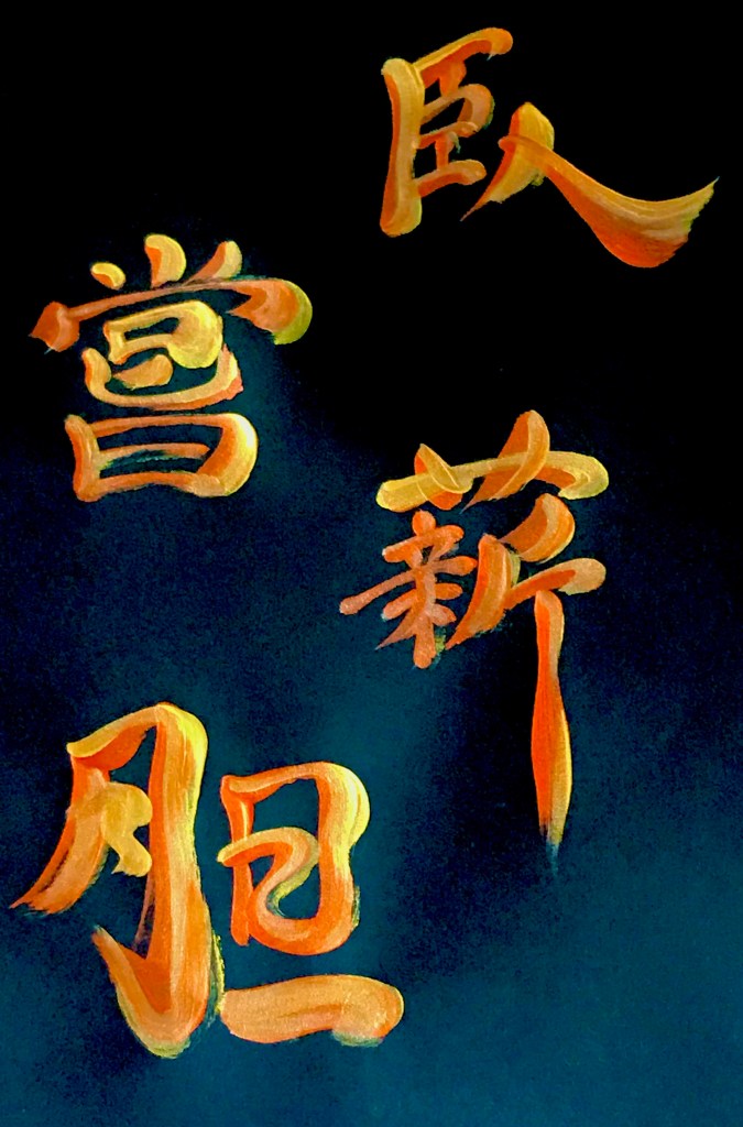 臥薪嘗胆 (ga-shin-sho-tan) “stopping at nothing to achieve one’s goal” Posted byVickyMay 5, 2022May 5, 2022Posted inUncategorizedTags:Calligraphy, Japanese calligraphy, japanese culture, Japanese idioms, Japanese language, Japanese words, 書道, 書道アート One of my favourite Japanese 4-character idioms. 臥 = to bow 薪 = fuel 嘗 = burn up 胆 = courage Share this: Share on X (Opens in new window) X Share on Facebook (Opens in new window) Facebook Like Loading... Related