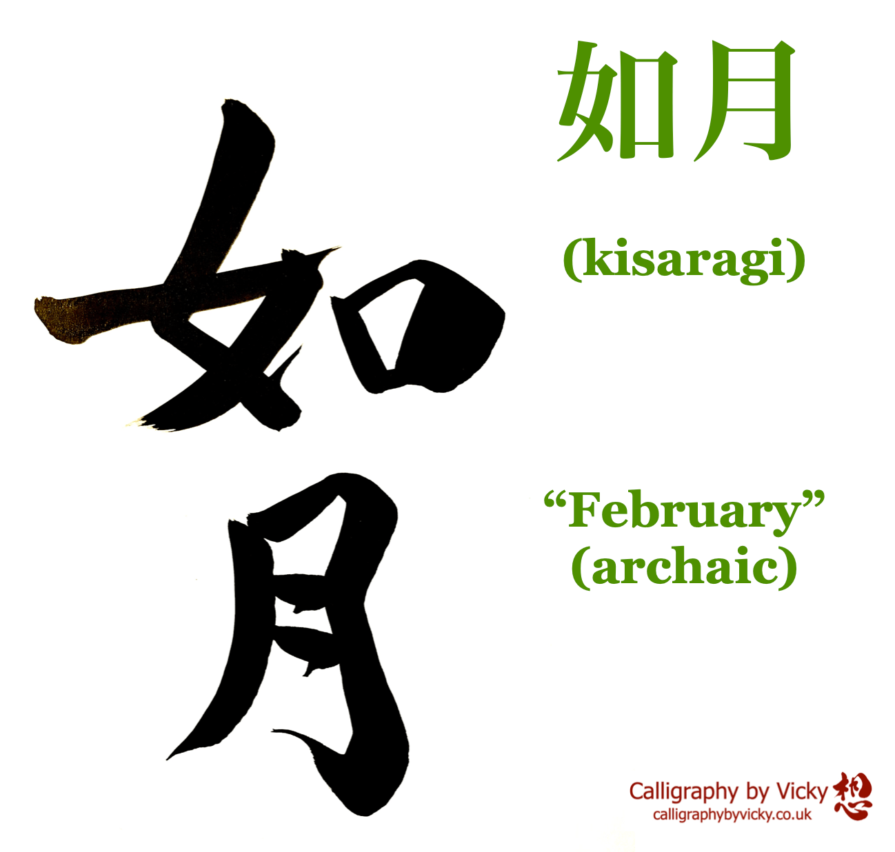 “February” is 如月. Japanese learners will recognise the kanji 月 as “moon” or “month”.