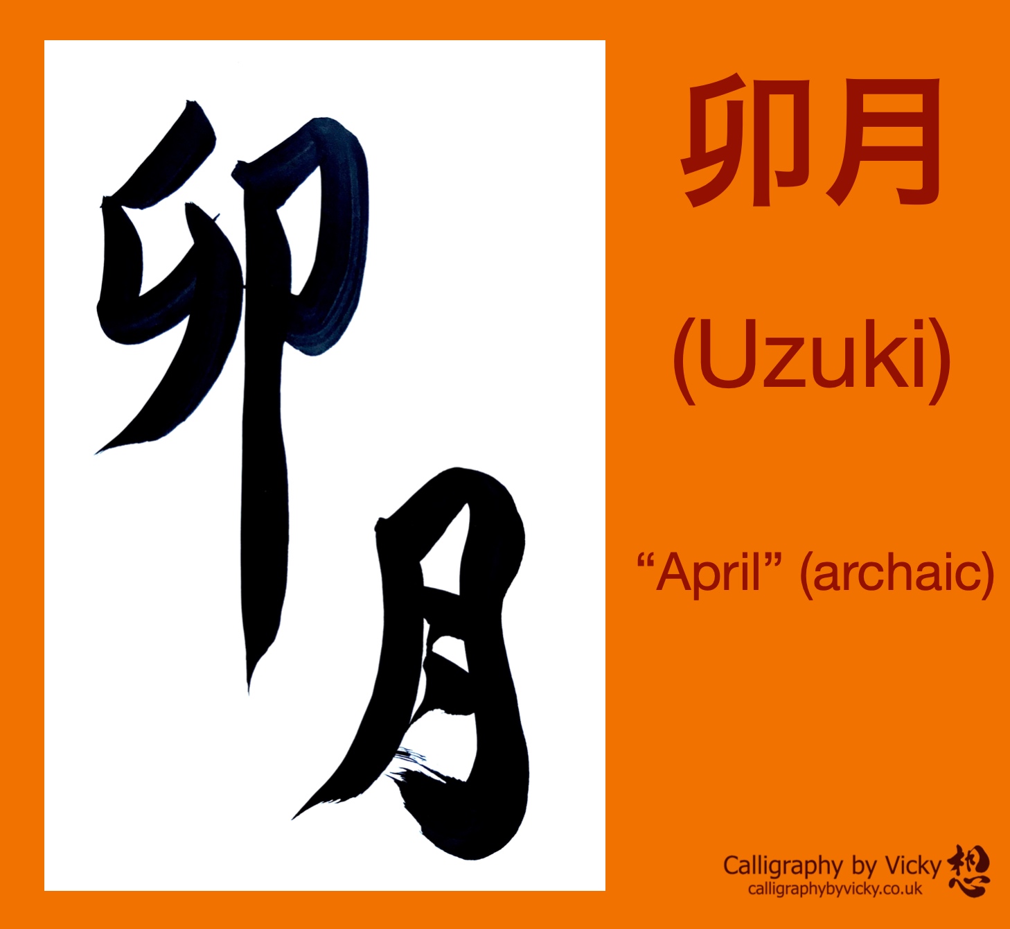 April is 卯月. Japanese learners will recognise the kanji 月 as “moon” or “month”. The first kanji is less common. It is most often used to represent the Sign of the Rabbit in East Asian Horoscopes, and the Year of the Rabbit uses this sign too.