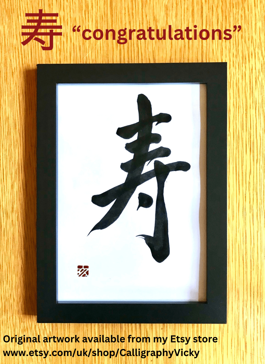 It is also the first kanji in the most common way to write sushi -(寿司). This kanji is used for “sushi” not because it has anything connected to raw fish on rice, but because another way to read it is “su”, and because it has a positive meaning. It’s appropriate because sushi is often served at special occasions.