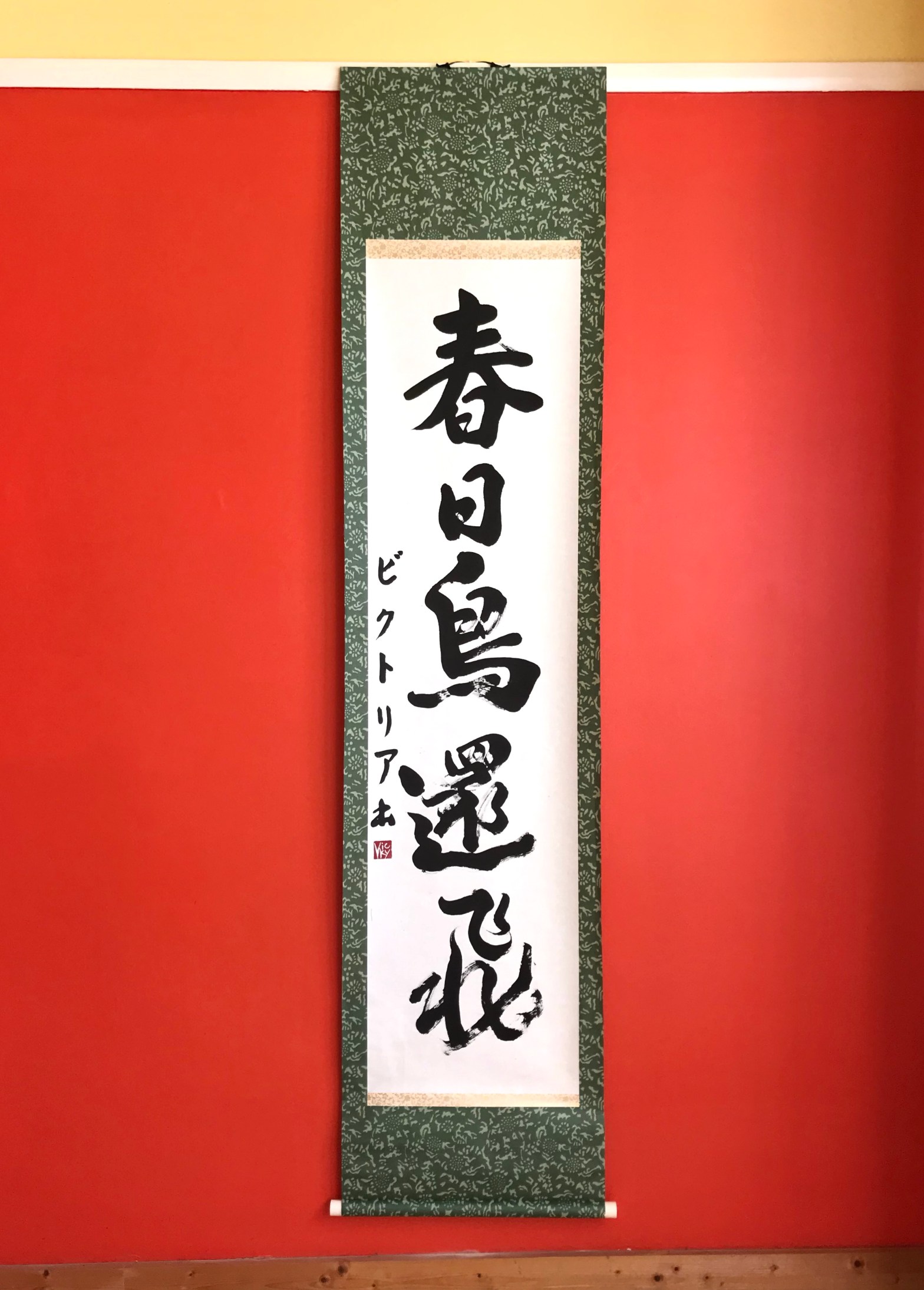 So a loose translation is “In spring days, birds fly back.” The birds can refer to hope and good feeling, as well as a sign of spring.