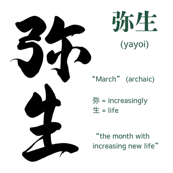 In other words, “the month with increasing new life”. This befits the time of year when it is spring in the Northern hemisphere, and Japan enjoys beautiful spring blossoms such as cherry blossom and plum blossom.