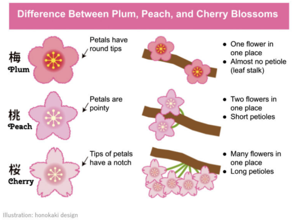 The most well-known are cherry blossoms. Plum and peach blossoms are popular too. They look similar, but there are some key differences: